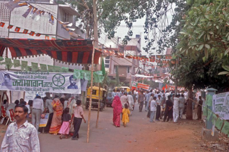 Beschreibung: Im prominenten Wahlkreis von New Delhi waren Nachwahlen notwendig geworden, nachdem der Oppositionsführer Lal Krishna Advani ihn geräumt hatte. L. K. Advani hatte in den Wahlen von 1991 auch den Wahlkreis von Gandhinagar gewonnen. Die Nachwahlen wurden zu einem Kräftemessen zwischen Kongreßregierung und der oppositionellen BJP. Beide Parteien schickten ehemalige Schauspieler ins Feld, Rajesh Khanna und Shatrughana Sinha. Rajesh Khanna (Kongreß) gewann schließlich und nahm der BJP diesen Wahlkreis ab. Der Kongreß wähnte sich sicher. Doch bereits sechs Monate später holte die BJP mit der Zerstörung der Babri-Moschee von Ayodhya zum Gegenschlag aus. - Bilderinfos: Wahlen in bewegten Zeiten